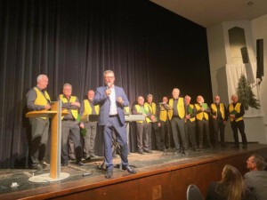 Nun waren die Sänger der Liedertafel Dülken, mittlerweile nicht mehr aus dem Programm wegzudenken, an der Reihe. Neben weihnachtlichen und heimatverbundenen Klängen, die zum Mitsingen einluden, stimmten sie auch ein altes Lied von Udo Jürgens an, dass aufgrund des Zeitgeschehens nichts von seiner Aktualität eingebüßt hat. Im Anschluss daran beehrte uns der Nikolaus, wieder in Gestalt von Wolfgang Genenger. Er ließ das vergangenen Jahr Revue passieren und schlug einen Bogen in die nahe Zukunft. Mit einer amüsanten Weihnachtsgeschichte beschloss er seine Ansprache. Selbstverständlich hatte er auch wieder für alle Teilnehmer einen großen Weckmann im Gepäck.
